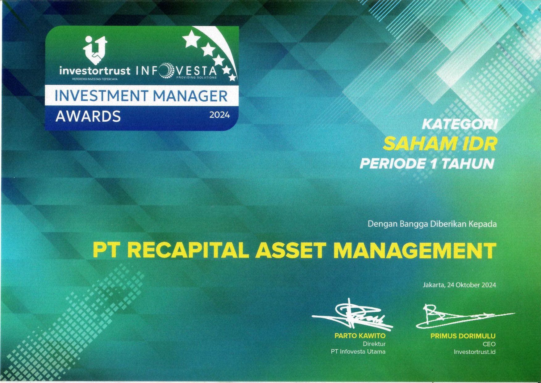 Reksa dana Saham yang dikelola PT Recapital Asset Management kembali meraih penghargaaan sebagai salah satu reksa dana dengan performance terbaik di tahun 2024 untuk kategori : Reksa Dana Saham Rupiah dalam 1 tahun. Terima kasih kepada penyelenggara acara IMA 2024 yaitu www.infovesta.com dan www.investortrust.id untuk…